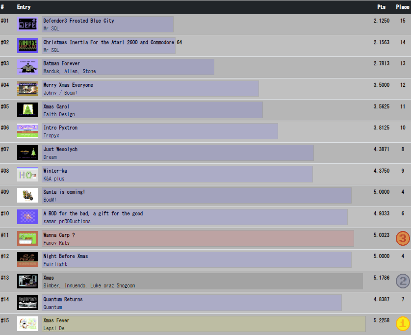Mieliśmy okazję zobaczyć debiut koderski Johny'ego. Gratuluję. Najmłodszy uczestnik konkursu miał 5 lat. Pozdrawiamy Helenę - córkę Pajdy. Rośnie nam nowe pokolenie C64. Dj Gruby zaszokował wszystkich opuszczeniem Triad i wypuszczeniem w konkursie dema pod starym szyldem grupy Quantum. Samar do konkursu wstawił technicznie i graficznie dopieszczone demo ROD (i nie, nie są to rodzinne ogródki działkowe). Mieliśmy również okazje zapoznać się z ciekawymi produkcjami grup Dream i Tropyx. Dziękuje!.