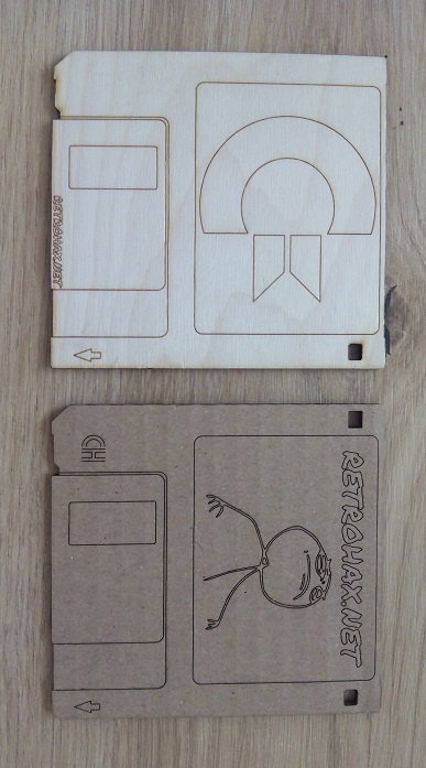 Sam brelok był dla mnie miłą niespodzianką, a w paczce z nim znalazłem również podkładki pod kubki. Są to podkładki w kształcie dyskietek 3,5 cala, wycinane laserowo. Jedna z nich z tekstury falistej, druga z cienkiej sklejki. Ta druga jest dostępna w sklepie Retrohax.net"