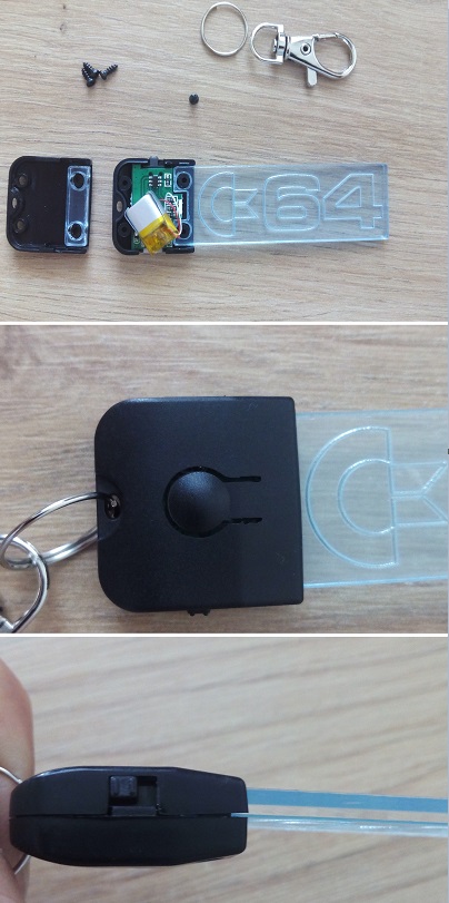 "Jako nagrodę w ramach konkursu prowadzonego przez portal c64.fun, dotyczącego pomysłu na slogan przewodni tegoż portalu, otrzymałem brelok z logo C64. Nie jest to byle jaki brelok. Posiada funkcję podświetlania w 7 kolorach: niebieski, zielony, czerwony, błękitny, żółty, fioletowy oraz biały. Oprócz tego brelok potrafi emanować tymi kolorami w dwóch trybach: płynnym i pulsacyjnym. Światło jest na tyle silne, że możemy oświetlić ciemne pomieszczenie. Jeśli już sprawdzimy jak każda rzecz wygląda w świetle breloka, można go wyłączyć. A gdyby nie znudziła się ta zabawa, ale brelok przestał świecić, mamy możliwość naładowania urządzenia poprzez dołączony do zestawu kabelek USB (USB A < - > USB Micro B). Tak, brelok posiada wbudowany miniakumulatorek.